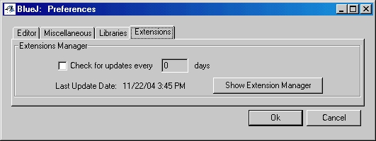 Extension manager is an extension to BlueJ that provides a simple and straight forward mechanism for installing, updating or deleting an extension. Once installed by downloading and copying it to the BlueJ extensions directory it is possible to configure how often the extensions manager will check for new available extensions by changing the preset value of the extensions preference Panel. Below there is an example of the Extensions Preference Panel.